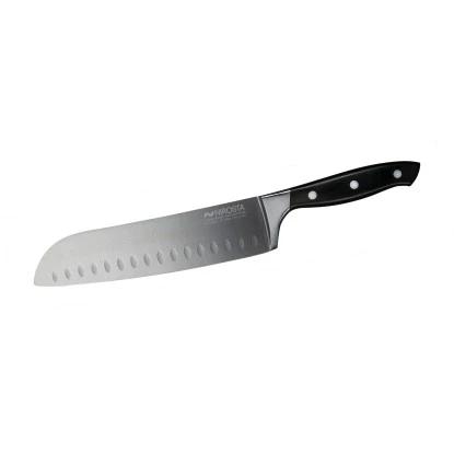 Das Fackelmann Santokumesser Nirosta Trinity mit einem ergonomischem Griff und einer handgeschärten Klinge hat eine Gesamtlänge von 34 cm.