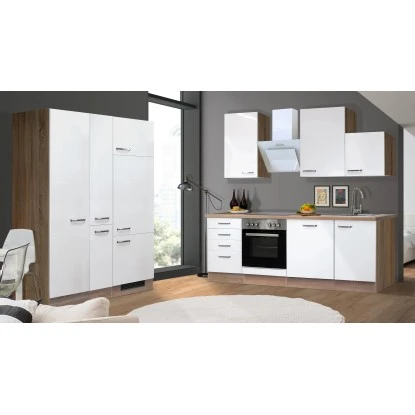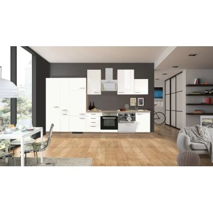 Diese moderne Küche mit einer Gesamtbreite von 360 cm ist ideal für Familien und ambitionierte Hobbyköche und bietet neben der hohen Funktionalität viel Stauraum für Geräte und Vorräte. Die Türen der Schränke sind sowohl für den links- als auch rechtsseitigen Aufbau vorbereitet, was Ihnen ein Höchstmaß an Flexibilität bei der Montage bietet. Die 140 cm breite Einheit aus Geschirr-, Apotheker- und Geräteschrank inkl. Kühlschrank lässt sich individuell stellen und passt sich so den unterschiedlichen räumlichen Gegebenheiten perfekt an. Die hochwertigen und pflegeleichten Kunststofffronten und die stabile Bauweise der Schrankkörper garantieren Ihnen lange Freude an Ihrer Küche. Eine Arbeitsplatte im passenden Design gehört bei unseren Küchenzeilen natürlich immer dazu. Eine gut verständliche Aufbauanleitung sowie sämtliche Beschläge liegen selbstverständlich dabei.
