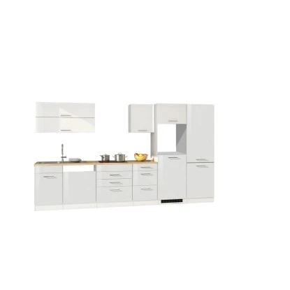 Die Serie Mailand zeichnet sich durch die hochglänzende MDF-Front, attraktiven Metallgriffen sowie der pflegeleichten Korpus-Kunststoffoberfläche aus. Die Schränke innen sind in Weiß gehalten. Zusätzlich findet sich hier eine Arbeitsplatte im Eiche Dekor ohne Ausschnitt für einen variablen Einsatz der Spüle.