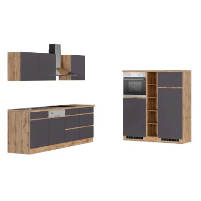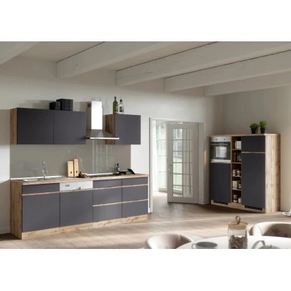 Die Küchenzeile Turin von Held Möbel mit hochwertigen MDF-Fronten begeistert optisch durch die klaren Linien sowie die zweifarbige Gestaltung. Da die Schränke in zwei Farbkombinationen verfügbar sind, können Sie die Küche im Mix-and-Match Stil erweitern. Zusätzliche Akzente werden durch die 38 mm starke Arbeitsplatte im Beton Dekor gesetzt.