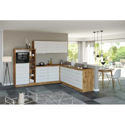Die Küchenserie FLORENZ besticht durch ihre 2 absolut trendstarken Dekorkombinationen, in denen immer das ausdrucksstarke Wotan-Eichedekor eine entscheidende Rolle spielt. Elegante Metall-Griffleisten an hochwertigen MDF-Fronten mit Lisene in Mattweiß und Mattgrau werden mit einem ausdrucksstarken Eichedekor beim Korpus und der Arbeitsplatte kombiniert. So entsteht eine herausragende Optik, die genau den aktuellen Trend widerspiegelt. Eine Vielzahl an vordefinierten Zeilen und Winkel und verschiedenste Ergänzungsmöbel lassen keine Wünsche offen. In den Auszügen und hinter den Türen wird reichlich Stauraum für Küchenutensilien, Kochgeschirr und mehr geboten. Als Montagehilfe sind die einzelnen Schränke mit höhenverstellbaren Ausgleichsfüßen ausgestattet. Bestimmt werden Sie hier Ihre perfekte Küche finden!