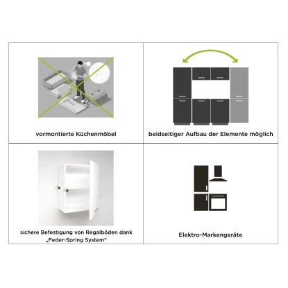 Die Küchenzeile Bea überzeugt durch italienisches Design, vielfältige Funktionen und bereits integrierte Elektrogeräte. Die Einbauküche ist geeignet für die erste Wohnung, einen Single-Haushalt oder das Büro. Dank