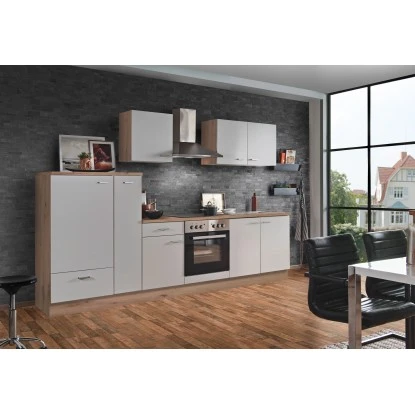 Die Küchenzeile Artisan Classic 300 cm in Weiß überzeugt mit zeitloser Optik und durch ein unschlagbares Preis-Leistungsverhältnis. Die Küche besticht insbesondere durch die Kombination aus Design, Funktion und Robustheit. Sie besteht aus Kühlschrank mit ***Gefrierfach, Edelstahl-Herd mit Backofen und Dunstabzugshaube, Spüle mit Unterschrank, einem weiteren Unterschrank mit Schublade, einer Schublade unter dem Kühlschrankumbau und Hängeschränken. Die Arbeitsplatte wird ohne Ausschnitte in einer Stärke von 38 mm geliefert.