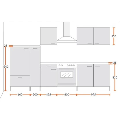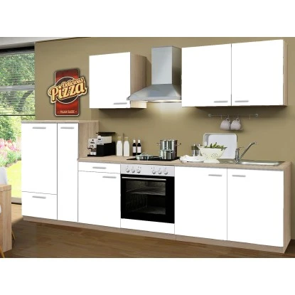 Die Küchenzeile Classic mit einer Breite von 300 cm überzeugt mit zeitloser Optik und ein unschlagbares Preis-Leistungsverhältnis. Die Küche besticht insbesondere durch die Kombination aus Design, Funktion und Robustheit. Alle Möbelteile werden in Deutschland gefertigt und zeichnen sich durch hochwertige Qualität aus. Die teilweise mit Schubladen ausgestatteten Unterschränke, die Hängeschränke und der Apothekerschrank bieten viel Stauraum für Ihre Küchenutensilien. Zudem sorgen die modernen Elektrogeräte für hohen Komfort beim Kochen. Die Küchenzeile besteht aus Kühlschrank mit 3-Sterne-Gefrierfach, Edelstahl-Herd mit Backofen und Dunstabzugshaube, Spüle mit Unterschrank, einem weiteren Unterschrank mit Schublade, einer Schublade unter dem Kühlschrank, Apothekerschrank und Hängeschränken. Die Arbeitsplatte wird ohne Ausschnitte in einer Stärke von 28 mm geliefert.