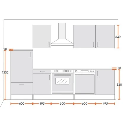 Die Küchenzeile Premium mit einer Breite von 280 cm überzeugt mit zeitloser Optik und ein unschlagbares Preis-Leistungsverhältnis. Die Küche besticht insbesondere durch die Kombination aus Design, Funktion und Robustheit. Alle Möbelteile werden in Deutschland gefertigt und zeichnen sich durch hochwertige Qualität aus. Die teilweise mit Schubladen ausgestatteten Unterschränke und die Hängeschränke bieten viel Stauraum für Ihre Küchenutensilien. Zudem sorgen die modernen Elektrogeräte für hohen Komfort beim Kochen. Die Küchenzeile besteht aus Kühlschrank mit 3-Sterne-Gefrierfach, Edelstahl-Herd mit Backofen und Dunstabzugshaube, Geschirrspüler, Spüle mit Unterschrank, einem weiteren Unterschrank mit Schublade, einer Schublade unter dem Kühlschrank und Hängeschränken. Die Arbeitsplatte wird ohne Ausschnitte in einer Stärke von 38 mm geliefert.