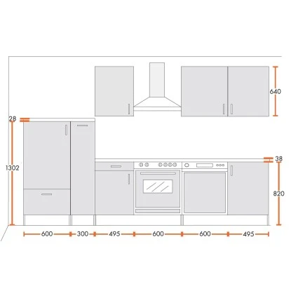 Die Küchenzeile Premium mit einer Breite von 310 cm überzeugt mit zeitloser Optik und ein unschlagbares Preis-Leistungsverhältnis. Die Küche besticht insbesondere durch die Kombination aus Design, Funktion und Robustheit. Alle Möbelteile werden in Deutschland gefertigt und zeichnen sich durch hochwertige Qualität aus. Die teilweise mit Schubladen ausgestatteten Unterschränke, die Hängeschränke und der Apothekerschrank bieten viel Stauraum für Ihre Küchenutensilien. Zudem sorgen die modernen Elektrogeräte für hohen Komfort beim Kochen. Die Küchenzeile besteht aus Kühlschrank mit 3-Sterne-Gefrierfach, Edelstahl-Herd mit Backofen und Dunstabzugshaube, Geschirrspüler, Spüle mit Unterschrank, einem weiteren Unterschrank mit Schublade, einer Schublade unter dem Kühlschrank, Apothekerschrank und Hängeschränken. Die Arbeitsplatte wird ohne Ausschnitte in einer Stärke von 38 mm geliefert.