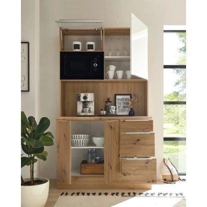 Das Respekta Buffet mit Mikrowelle zu Küchenzeile Marleen ist in verschiedenen Farben erhältlich und schafft durch den Materialmix von Elementen in Holz- und Griffleisten in Aluminiumoptik ein modernes Design. Die Schränke bieten Ihnen viel Stauraum und schließen dank der Soft Close Funktion besonders geräuscharm. Unebenheiten im Boden gleichen Sie mit den höhenverstellbaren Füßen ganz einfach aus.
