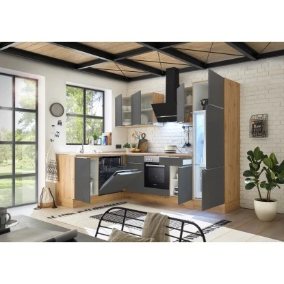 Das Respekta Küchenzeile Marleen ist in verschiedenen Farben erhältlich und schafft durch den Materialmix von Elementen in Holz- und Griffleisten in Aluminiumoptik ein modernes Design. Die Schränke bieten Ihnen viel Stauraum und schließen dank der Soft Close Funktion besonders geräuscharm. Unebenheiten im Boden gleichen Sie mit den höhenverstellbaren Füßen ganz einfach aus. Die Zeile kommt in Winkelform.