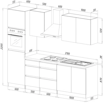 1 Hochschrank für Kühlschrank und Backofen: 220,5 cm x 60 cm x 60 cm