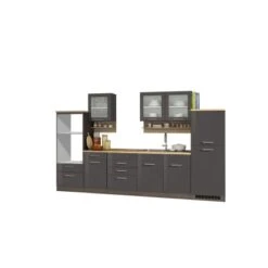 Ausgestattet ist die Küchenzeile mit stromsparenden Elektrogeräten wie Einbauherd, Dunstabzugshaube, Geschirrspüler und einer Kühl-/Gefrierkombination. Das Einbauherdset mit Glaskeramikkochfeld sorgt für größtmögliches Back- und Kochvergnügen. Die moderne Kopffreihaube bietet viel Bewegungsfreiraum und erleichtert den Zugriff auf die hinteren Kochstellen. Der integrierte Geschirrspüler erspart Ihnen lästiges Abwaschen per Hand. In der großen Kühl- und Gefrierkombination finden mühelos all Ihre Lebensmittel und Getränke Platz.